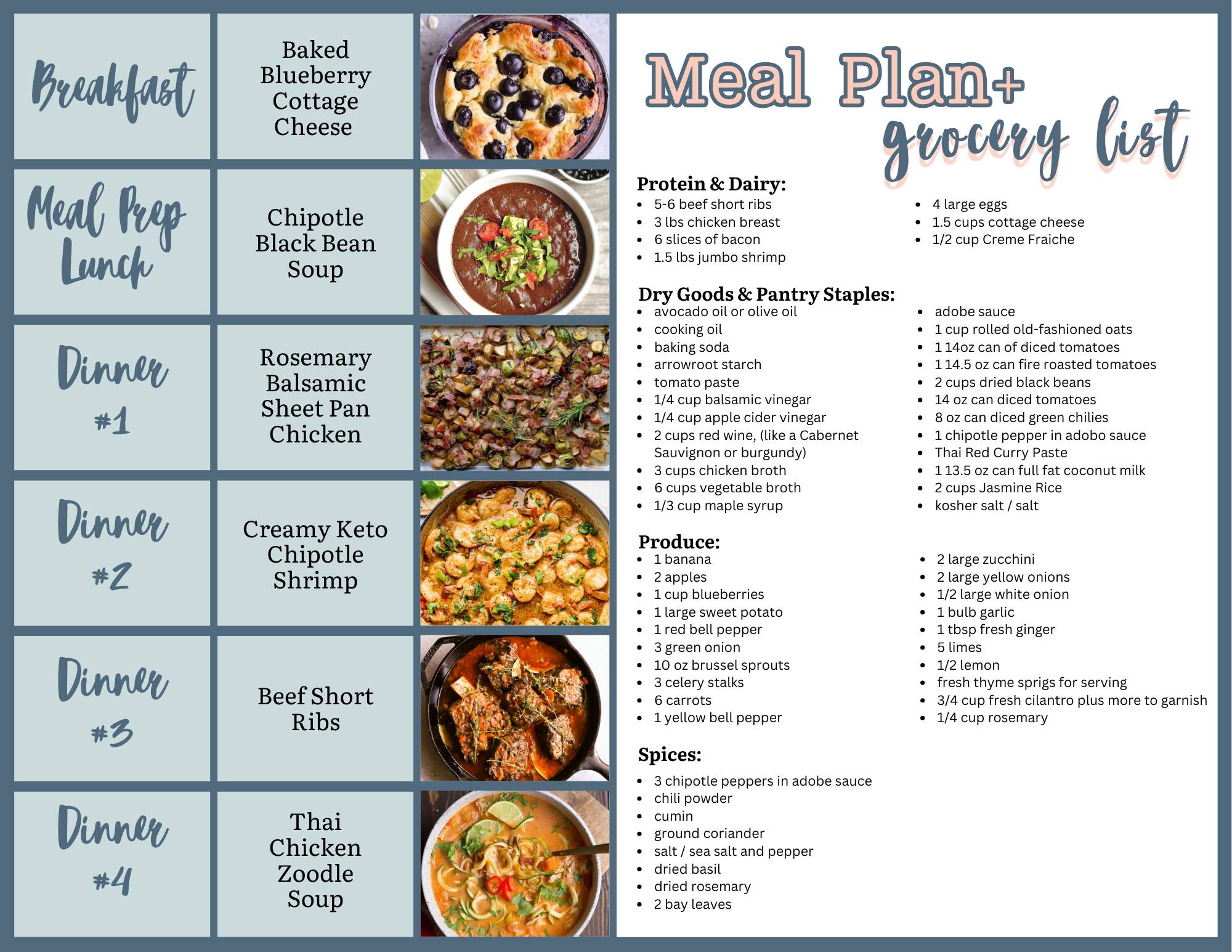 Hi friends! Here is the meal plan for 8/17. Scroll down below for links to all recipes and a grocery list for the ingredients. On the menu this week: Breakfast: Savory Breakfast N’Oatmeal Meal Prep Lunch: Instant Pot Lime Teriyaki Chicken Dinner Recipes: Rosemary Balsamic Sheet Pan Chicken Chipotle Enchilada Meatballs serve with 10-Minute Rice Cauliflower Rice Paella Thai Basil Beef Stir Fry Click Here to Download Recipes!