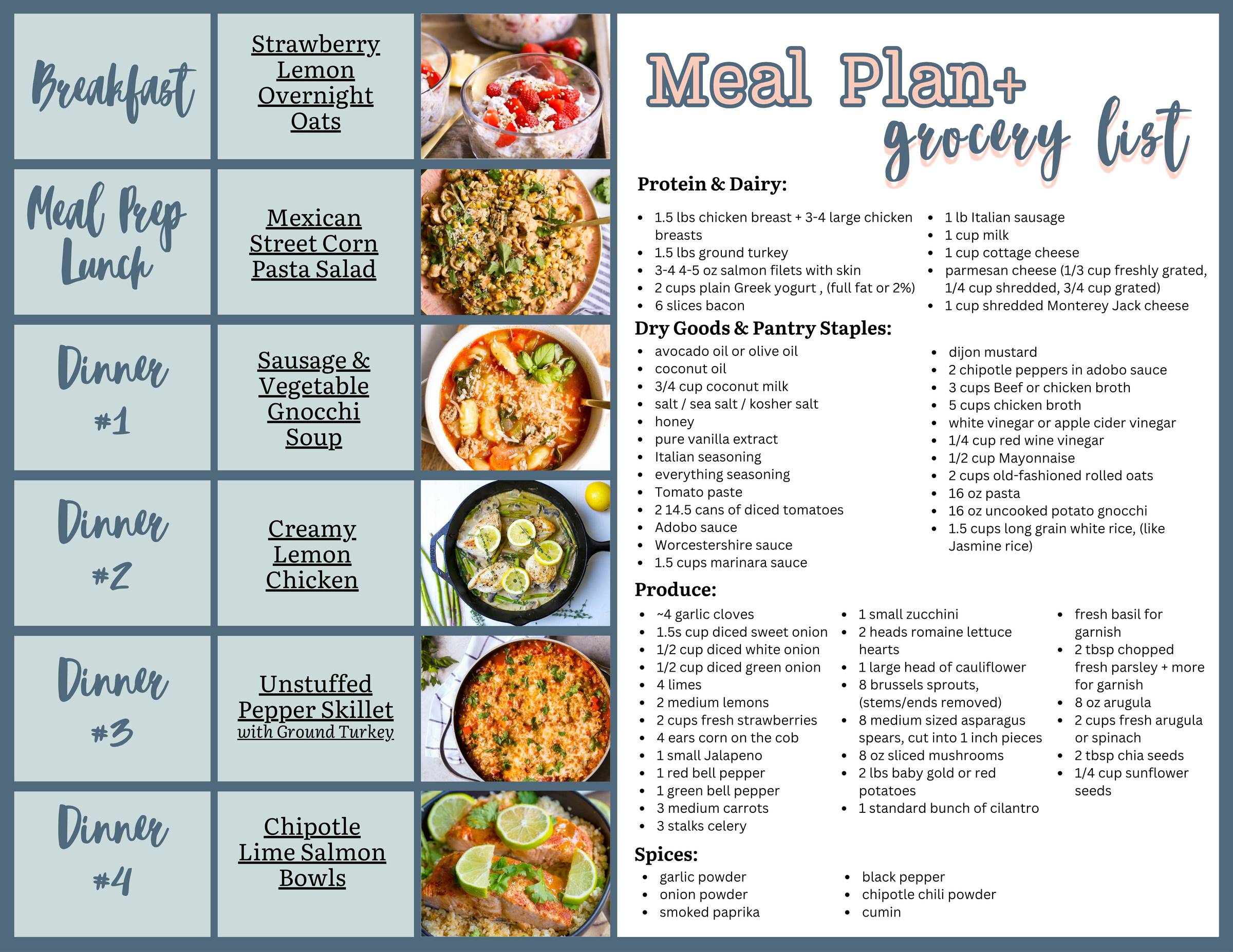 Hi friends! Here is the meal plan for 3/29. Scroll down below for links to all recipes and a grocery list for the week! On the menu this week: Breakfast: Strawberry Lemon Overnight Oats (5-Minute Meal Prep!) Meal Prep Lunch: Mexican Street Corn Pasta Salad with Chicken Dinner Recipes: Sausage and Vegetable Gnocchi Soup serve with Easy House Salad Creamy Lemon Chicken with Asparagus and Mushrooms serve with Crispy Parmesan Sheet Pan Potatoes Unstuffed Pepper Skillet with Ground Turkey Instant Pot Chipotle Lime Salmon Bowls
